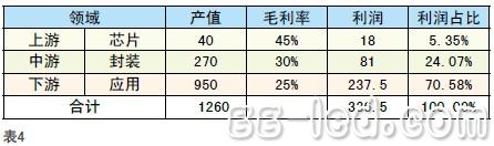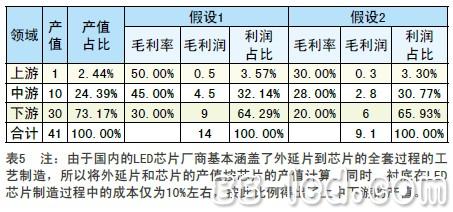 從表4可以得出,國內LED產業鏈中,LED上游領域所占的利潤比例更低,僅僅為5.35%,相反下游的應用領域卻攫取的70%的行業利潤。