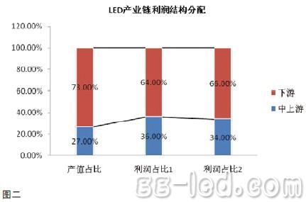 從圖2可以清晰的看出,中上游在LED產業鏈中的產值比例為26.83%,而利潤占比也僅僅位35.71%。這就說明上游領域的利潤占比將不會超過35.71%,也就是說遠遠不能滿足上游領域占70%利潤的說法。