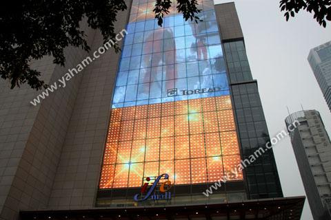 領先的led顯示屏系統解決方案提供商大族元亨為重慶第一高樓——英利國際金融中心打造的一塊新型全彩LED格柵屏終于和觀眾亮相了,這塊大屏顯示面積達840平米,像素間距為31.25mm,采用輕薄的轉角結構,顯示屏藏于玻璃幕墻內,亮起來取得夢幻般效果。