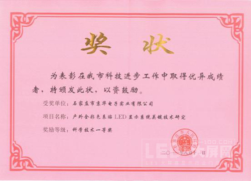會上共頒發了83項科學技術進步獎,7項科學技術進步組織獎。由京華電子立項研發“戶外全彩色表貼LED顯示系統關鍵技術研究”項目,榮獲了石家莊市科學技術一等獎。