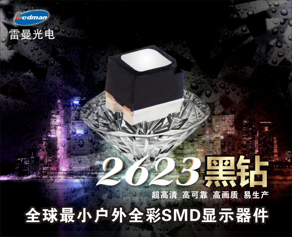 我司將發布世界上最小尺寸的防水貼片顯示器件——黑鉆2623。此產品擁有核心自主知識產權。為紅、綠、藍三合一PLCC封裝形式,長、寬、高的尺寸為2.68mm、2.36mm、2.40mm,適用于戶外高清全彩LED顯示屏,具有防水、防潮、抗高低溫、防紫外線、耐鹽霧等卓越性能,在高亮度、大角度、對比度、柔和度等方面有很好的表現。