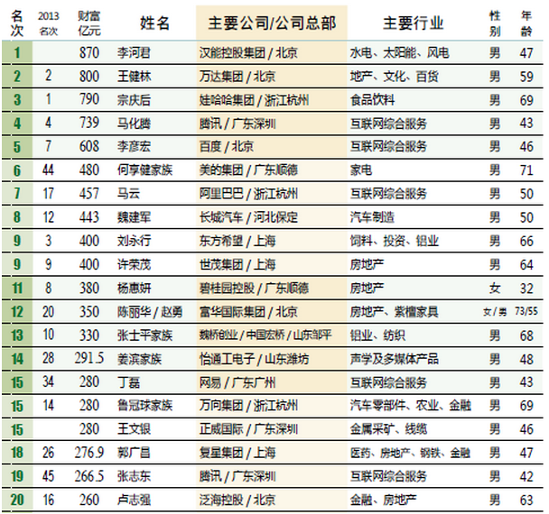 昨日,“2014《新財富》500富人榜”新鮮出爐,該榜單是繼2011經濟發展放緩之后,再創新高,并且出現難得一見的“大換血”現象,其中漢能集團作為黑馬脫穎而出,雄踞2014財富榜首富之位,而在并購整合領域風生水起的“BAT教主”——李彥宏、馬化騰、馬云組團殺入前十,終結了地產富豪在前十排名中的一貫優勢,見證了中國經濟領域的風云變化。