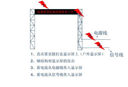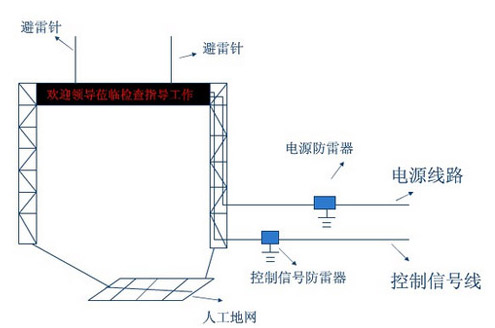2、針對鋼結構的反擊,將剛結構與;ED顯示屏的外殼相連,做好等電位,并做好接地,接地阻值一般要求小于10歐姆,阻值如果達不到要求,就要做附加的人工接地網。防雷器也要做好接地。