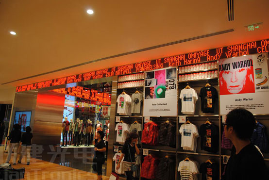 其三,在店鋪內一、二、五樓以及電梯上方安裝6套規格為F10和F12的單紅LED顯示屏,面積合計64.457㎡,用以展示新品、服務提示等簡單動態,能讓客人感覺到優衣庫熱情、親切的服務;