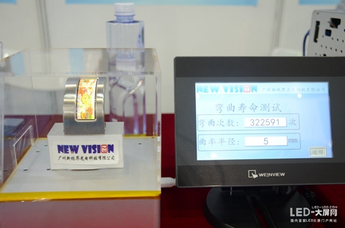 在展位上,重量不足1克、厚度僅0.01毫米的“塑料膜”,竟然是可以彎曲和折疊的顯示屏,引起了觀眾的注意。據悉,本次新視界參展的柔性顯示屏,是國內第一次以動態展示形式亮相,由機械裝置驅動彎折、拉升,該顯示屏集成了新視界自主開發的高遷移率Ln-IZO金屬氧化物TFT技術、高水氧阻隔薄膜封裝技術以及柔性襯底解離技術,達到與國外主流的LTPS工藝生產的TFT相當的性能,而且工藝更簡單、生產成本更低。現場展示的柔性屏已經拉升折疊了2000多次,仍然顏色亮麗,顯示效果良好,展示出其在可卷曲、可折疊終端的應用前景。