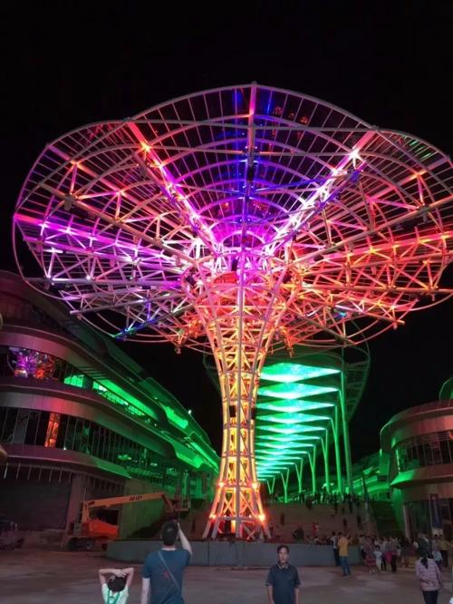 夜幕下的天幕商業街,燈光璀璨,整個天幕宛如龍行宇宙之間,從時空塔眺望銀河帶,夜晚的天幕街如同浩瀚宇宙中星光閃耀的神秘銀河。從地面仰視流光天幕,仿佛以星河為幕,以水為鏡。在距離天幕最近點,星空仿佛觸手可及,伸手摘星攬月,如同神仙一般,能給人無限的驚喜與遐想。