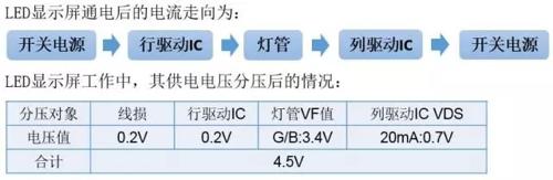 根據led顯示屏通電后的電流走向,綜合損耗及各用電器件的分壓之和正好4.5V,這一電壓讓led顯示屏正常工作,奠定了使用4.5V電源供電的理論基礎。