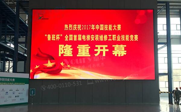 2017年,Voury卓華小間距led顯示屏點亮中國技能大賽“魯班杯”全國首屆電梯安裝維修工職業技能競賽決賽現場,采用Voury卓華ZHVW-250小間距led顯示屏,顯示面積達82.56㎡,主辦方及電梯全行業對Voury卓華小間距led顯示屏大屏幕完美展現做出了高度的肯定,尤其對大屏幕亮度、拼接縫隙,以及高清信號的處理贊嘆不已。