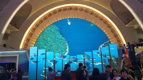 走過(guò)前廳,看到的是相對(duì)最大的2號(hào)展廳,其中最大的是扇形屏,該屏幕分辨率6144*3424點(diǎn),要求顯示完整的4K2K輸入信號(hào)畫(huà)面,所以使用了LVP609超高清視頻處理器,由兩臺(tái)處理器無(wú)縫拼接,以達(dá)到最佳顯示效果。