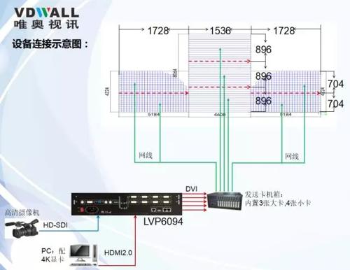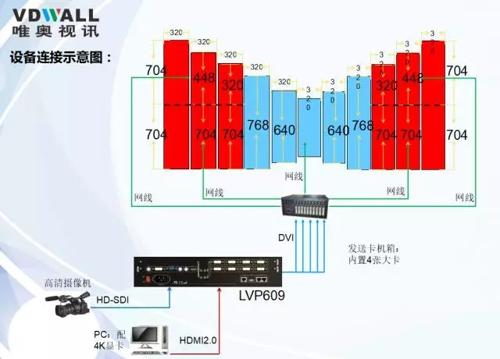 在扇形屏的前面有11個(gè)立柱屏,每個(gè)屏幕點(diǎn)數(shù)不同,也采用一臺(tái)LVP609處理器,具體方案如下:
