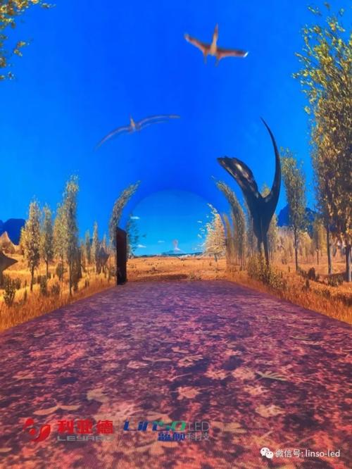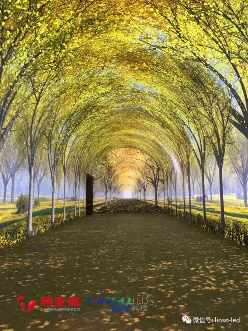 全新的數字化互動時光隧道通過對銀杏的一系列演繹,必定讓您對古老的銀杏有更深入了解,體驗真正的時光穿越感。全景展示了銀杏四季怡人的美景,春季銀杏吐翠、春意盎然;夏季濃蔭遮蓋、清涼氣爽;秋季金風送爽、滿眼金黃;冬季銀裝素裹、玉樹瓊花。隨著參觀者腳步的前進,足跡也從鮮花漫步、螢火蟲閃光變換到銀杏葉飛舞、雪地留印,感受四季更迭后隧道變換到銀杏與恐龍共存的鮮活場景。全部影像經過特殊3D處理,通過高對比度、高清小間距led大屏幕呈現出超現實的畫面感,時空的穿越帶來無限的遐想……