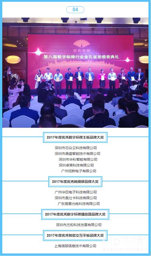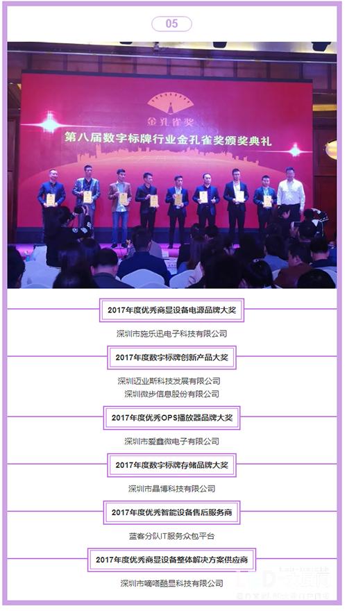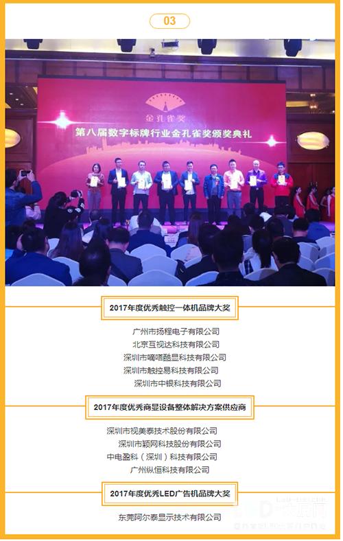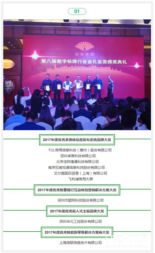 作為數(shù)字標牌行業(yè)頗有名氣的盛會,應是視聽覺相融合、榮耀加冕的宴會。而本屆活動除了帶來了聽——行業(yè)專家論行業(yè)發(fā)展之道;亦對于行業(yè)優(yōu)秀企業(yè)進行評選,精益求精,對優(yōu)秀之中的佼佼者授予金孔雀的最高榮譽;當然缺少不了視覺感受,主辦方在活動中設置了展示專區(qū),讓參會者零距離觀看數(shù)字標牌設備產(chǎn)品的廬山真面目。