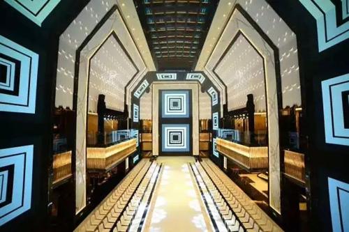 在酒店二層中廳大廳,利亞德承建了目前全球面積最大的室內異型屏。此項目整屏面積為528.5㎡(包括拱屏兩塊每塊210㎡,端點屏108.5㎡),采用利亞德集團金立翔公司碳纖維結構箱體和前維護設計,三塊屏體可同時顯示一組畫面,突顯整個中庭的顯示一體性,并采用了數控電機滿足客戶不同需求的編程。端點屏底部設計為開合屏,無線遙控控制開合屏的開啟和閉合,為此項目的最大亮點。
