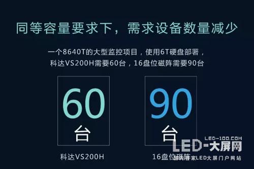 近期,科達在新建智能交通項目中用50臺VS200H成功替換了原計劃的120臺設備。該項目要求部署800多個點位的前端監控設備,預計需求存儲容量8000T以上,僅提供4間機房,原計劃部署的120臺設備無法容納。部署科達VS200H后,不僅磁陣數量減少了約58%,機柜數量也減少至6臺。