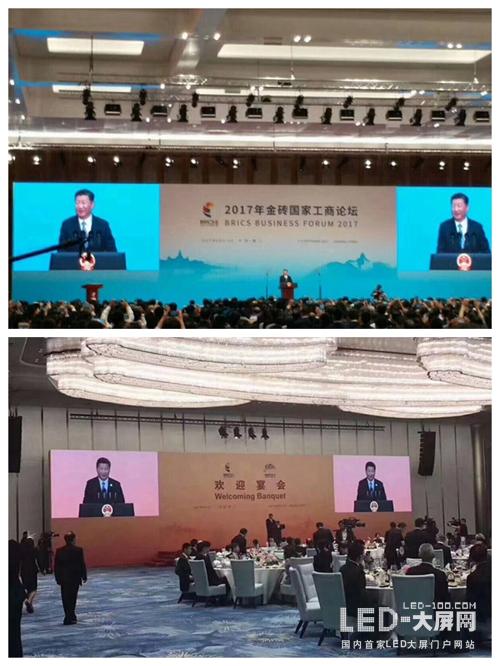廈門金磚會議的主會場設在廈門市思明區的廈門國際會展中心,作為國內LED租賃屏領域的領跑者,雷凌顯示也為此次大會提供了會議顯示方面的支持。在會議期間召開的2017年金磚國家工商論壇和峰會宴會廳的正前方安裝的兩塊實時播放領導人講話畫面的LED顯示屏均為雷凌顯示所生產制造的顯示屏。借著這一次機會,雷凌又像世界進一步展示了其高端、精美的顯示技術。