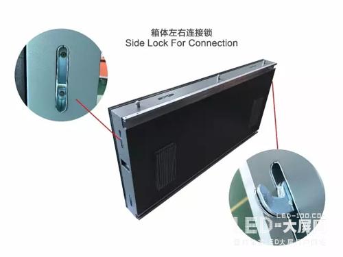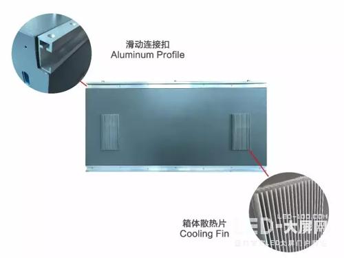 屏體之間采用旋轉連接鎖扣組合。并在水平中間位置用專門的鋁扣將兩個箱體加強固定。上下四個角用鋁扣固定在箱體滑動連接扣位置,再由鋁扣的螺絲孔固定在墻面上,省去安裝的鋼結構。鋁材質箱體,有效減輕箱體重量。該款箱體采用背后安裝散熱片的方式,使屏體散熱速度和效率大大提高 。