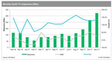 據IHS統計,全球OLED電視出貨量自2016年11月至2017年11月增長了130%,并創下27萬臺的新月度銷量紀錄。IHS表示,55英寸4K OLED電視的價格下降使其被更多假日購物者列入了采購清單。