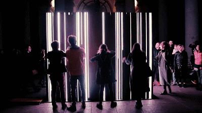 另一互動LED裝置作品《CONTROL NO CONTROL》。被放置于一個公共空間內(nèi),路過的行人可以隨意參觀或與作品進行互動。當觀眾站在作品前揮舞手臂時,會看到LED的形態(tài)也會來回波動,另外,觀眾還可以將手掌放置于LED表面,這簡單的幾何變化,仿佛給了參與者無限的魔力。