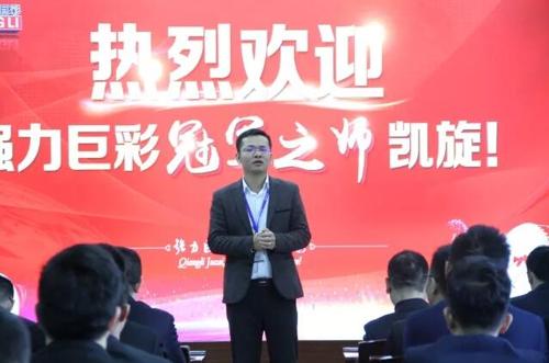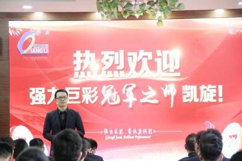 接著,載譽(yù)榮歸的冠軍之師迅速列隊整齊以待,強(qiáng)力巨彩董事長朱志強(qiáng)先生、營銷事業(yè)部代理總經(jīng)理?xiàng)铠欃F先生以及各中心負(fù)責(zé)人親臨迎接,舉辦了隆重的歡迎儀式。