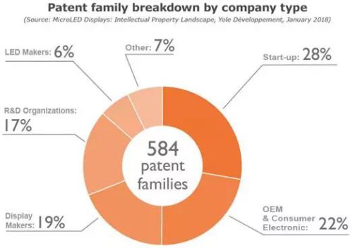 Yole在MicroLED顯示領域檢索出了125家企業和組織申請的近1500件專利。這些申請人包括了許多初創企業、顯示屏制造商、OEM廠商、半導體企業、LED制造商以及科研院所。