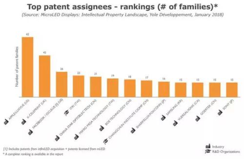 總體來看,MicroLED顯示領域的專利主要由初創企業和科研院所主導。除了Sharp和Sony以外的顯示屏制造商和LED制造商,進入該領域則相對較晚。事實上,很多廠商是在Apple(蘋果公司)收購Luxvue,展現了對MicroLED顯示技術的信心之后,才開始大力投入MicroLED顯示技術研發的。