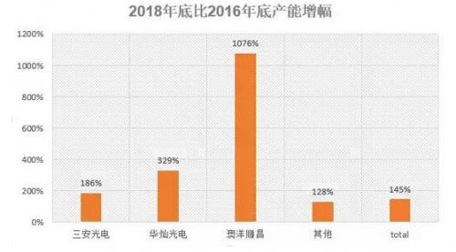 從供給結構的角度看,因為三安2017~2018年的擴產進度與幅度僅僅略高于全行業的擴產速度,相比之下盡管擴產的絕對數量不小,但是相對華燦和澳洋,擴產動作顯得過于保守。