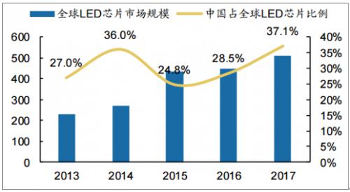 數據顯示,2017年中國LED芯片(不包括臺灣,下同)行業產值規模達到188億元,較2016年增長29.7%,占全球LED芯片產值比例達到40%;中國MOCVD保有量超過1600臺,全年凈增加246臺,LED芯片產能占全球的比例超過54%。